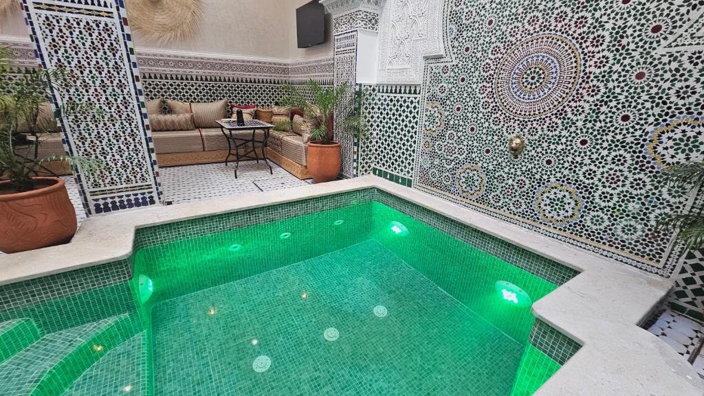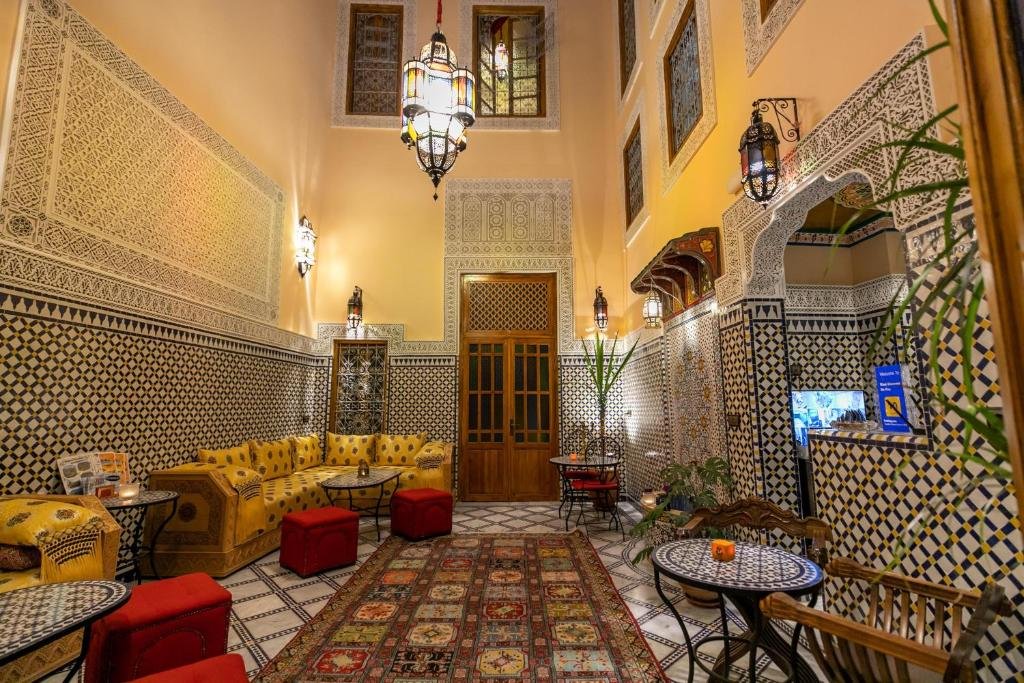 Riad Diamant Bleu in Fes is a beautifully designed riad that radiates elegance, comfort, and authentic Moroccan charm. Perfectly located in the heart of the medina, this refined guesthouse combines traditional craftsmanship with modern luxury. The interiors feature exquisite zellige mosaics, carved cedar wood, and soft, warm tones that create an atmosphere of serenity and sophistication. Each room is tastefully decorated, blending authentic Moroccan style with contemporary amenities for a relaxing and memorable stay. Guests can enjoy a delicious homemade breakfast on the rooftop terrace while admiring breathtaking views of the old city, or unwind in the peaceful courtyard after a day of exploration. Renowned for its warm hospitality, attention to detail, and tranquil setting, Riad Diamant Bleu offers an unforgettable experience — a perfect fusion of tradition, comfort, and elegance in the magical city of Fes.