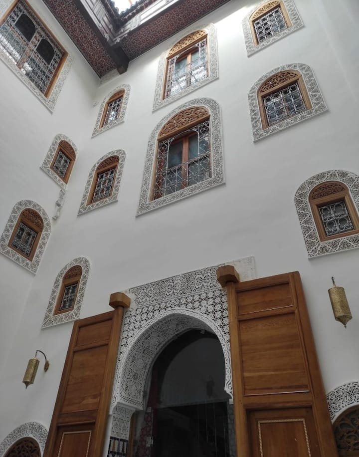 Riad Averroès Fès is a charming and elegantly restored riad located in the heart of the Fes Medina, offering guests an authentic Moroccan experience filled with comfort, culture, and tranquility. The property beautifully reflects the artistry of Fassi architecture, featuring colorful zellij tilework, carved cedarwood, and graceful arches that create a serene and refined ambiance. Each room is tastefully decorated with traditional Moroccan furnishings and modern amenities, blending authenticity with relaxation. Guests can enjoy a delicious Moroccan breakfast each morning, served in the peaceful courtyard or on the rooftop terrace with panoramic views over the Medina’s rooftops. The riad’s calm atmosphere, coupled with warm and attentive hospitality, makes it an ideal retreat after a day of exploring Fes’s historical landmarks and vibrant souks. Combining elegance, comfort, and genuine Moroccan charm, Riad Averroès Fès offers a memorable stay in the spiritual heart of Morocco.