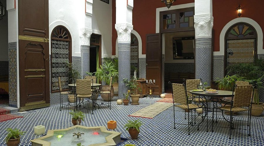 Riad Dar Tafilalet in Fes is a magnificent riad that beautifully blends traditional Moroccan elegance with refined comfort. Set in the heart of the medina, near Bab Boujloud and the main historical landmarks, this riad showcases exquisite craftsmanship — from intricate zellige mosaics and carved cedar wood to elegant arches and vibrant lanterns that illuminate its serene courtyards. Each room and suite is tastefully decorated, offering a unique mix of authenticity and modern convenience, creating a warm and restful atmosphere. Guests can savor a generous Moroccan breakfast or traditional home-cooked meals on the panoramic rooftop terrace, which offers breathtaking views over the medina and the surrounding hills. Renowned for its welcoming hosts, calm ambiance, and timeless beauty, Riad Dar Tafilalet offers a truly authentic and memorable Moroccan experience — a perfect blend of culture, comfort, and charm in the heart of Fes.