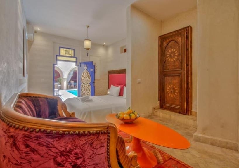 Riad La Villa Bleue Marrakech is a charming and elegantly designed riad nestled in the heart of the Marrakech Medina, offering guests an authentic Moroccan experience in a peaceful and refined setting. The property beautifully blends traditional craftsmanship with modern comfort, featuring intricate zellij mosaics, carved cedarwood, and a serene courtyard with a refreshing plunge pool. Each room is tastefully decorated with handcrafted Moroccan furnishings, warm colors, and luxurious touches, creating a cozy and inviting atmosphere. Guests can enjoy a delicious Moroccan breakfast each morning, served in the courtyard or on the rooftop terrace with panoramic views of the Medina and the Atlas Mountains. The riad also offers a hammam and spa services for complete relaxation. Known for its calm ambiance, elegant design, and attentive hospitality, Riad La Villa Bleue Marrakech provides a tranquil and memorable retreat in the vibrant heart of the red city.